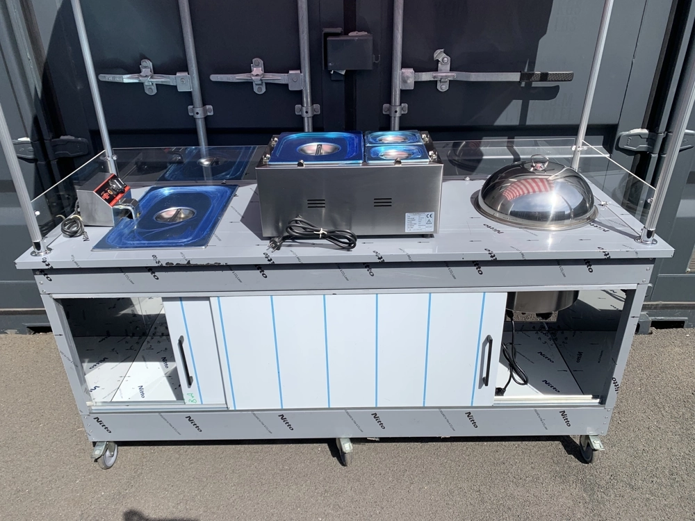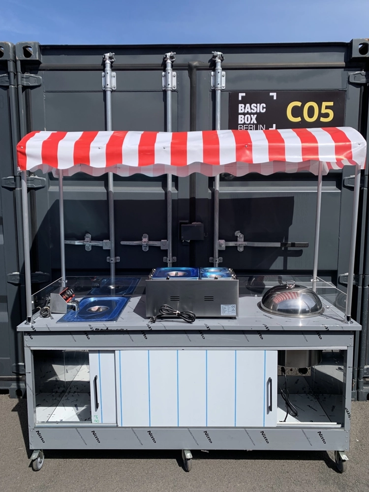 Oberfläche und Glasmerkmale: Die obere Arbeitsfläche besteht aus 0,80 mm dickem, 430 rostfreiem Stahl und bietet eine hygienische und langlebige Oberfläche. Die Höhe des Plexiglases beträgt 15 cm. Die Farbe des Dachs / der Markise ist Rot-Weiß.