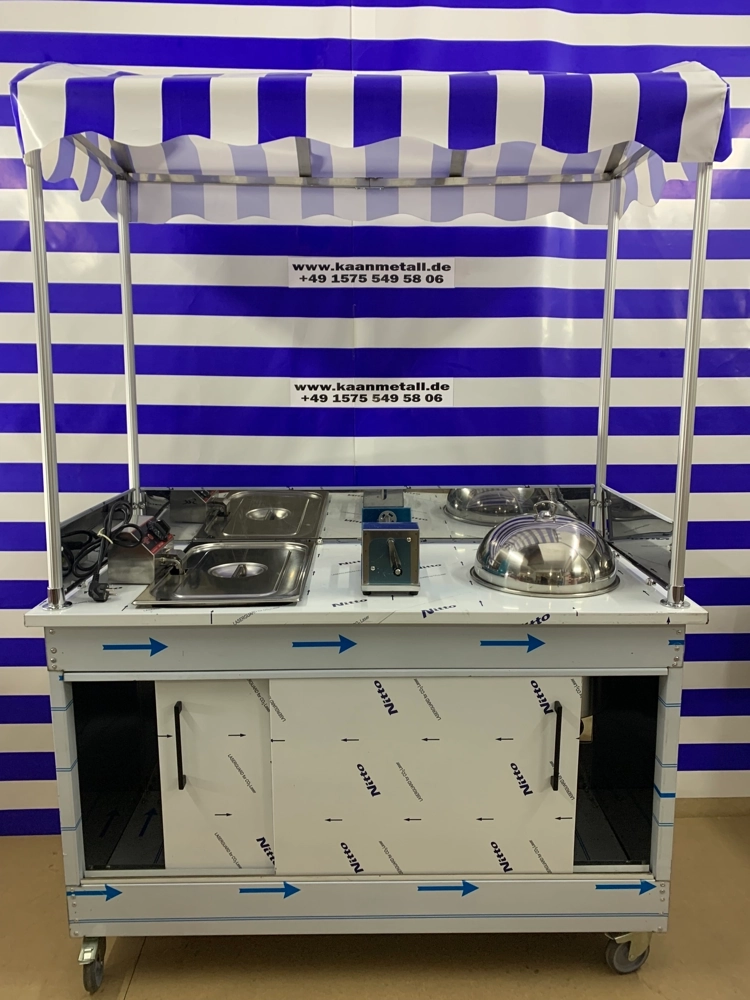 Üst Tezgah ve Cam Özellikleri: Üst tezgah, 0,80 mm kalınlığında 430 paslanmaz çelikten üretilmiştir, bu da hijyenik ve dayanıklı bir yüzey sunar. Cam yüksekliği 15 cm olup, 430 paslanmaz çelik sac kullanılarak üretilmiştir. Tente rengi isteğinize göre değiştirilebilir, böylece arabanızı markanızın renklerine veya iş yerinizin genel tasarımına uygun hale getirebilirsiniz.